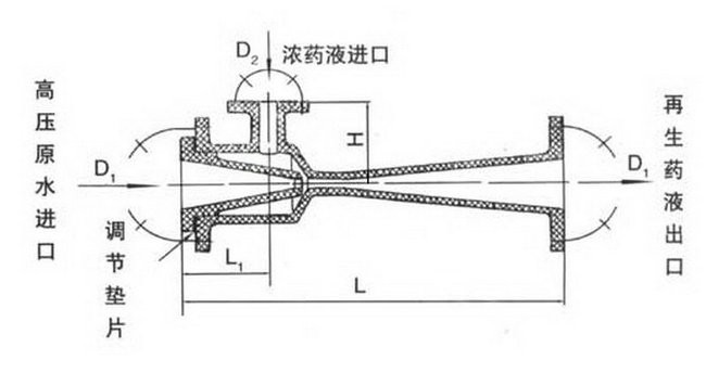 高壓原水通過管道閥門]進入噴射器的漸縮段,將靜壓頭轉換成動能,在噴嘴處成為高速射流,使混合室形成微真空狀態將高濃度的再生液吸入混合室,并使再生藥液的壓力和速度發生變化;在混合段內,水和藥液得到充分地混合,然后注經擴散段,使再生液減低流速,靜壓頭升高,再通過出口管道及閥門將稀再生液送到交換器本體中。